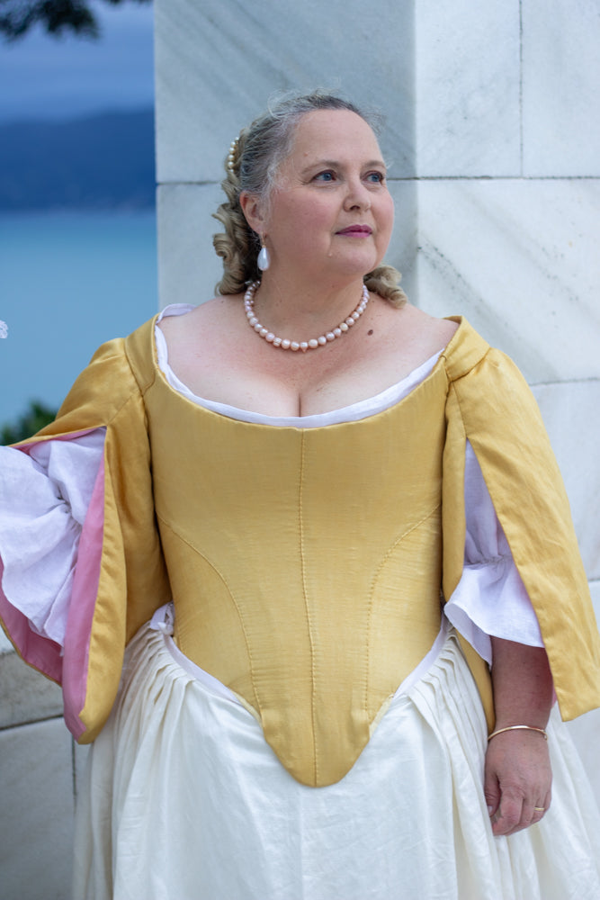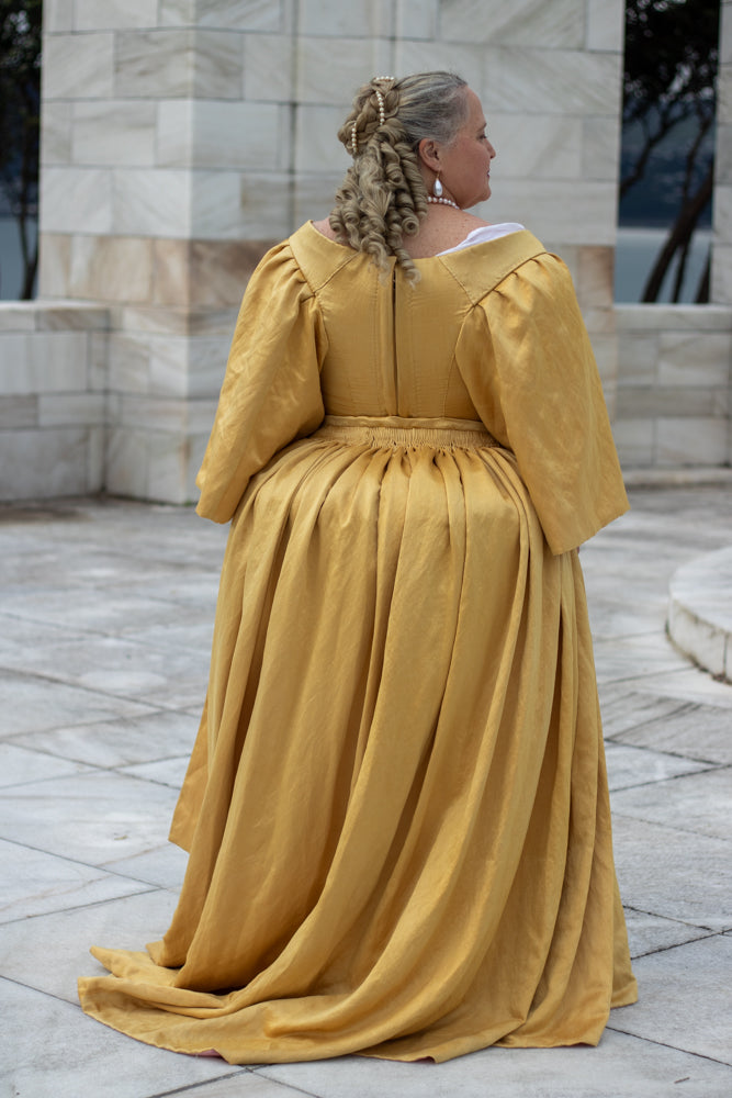 Nina is wearing View B in ivory silk-linen. Her View B skirt has forward-facing knife pleats In some photos it is topped with the View D trained overskirt in the same silk-linen custom-dyed yellow, faced with coral pink lightweight taffeta, also custom dyed. Her overskirt is cartridge pleated and she wears a Size 46.