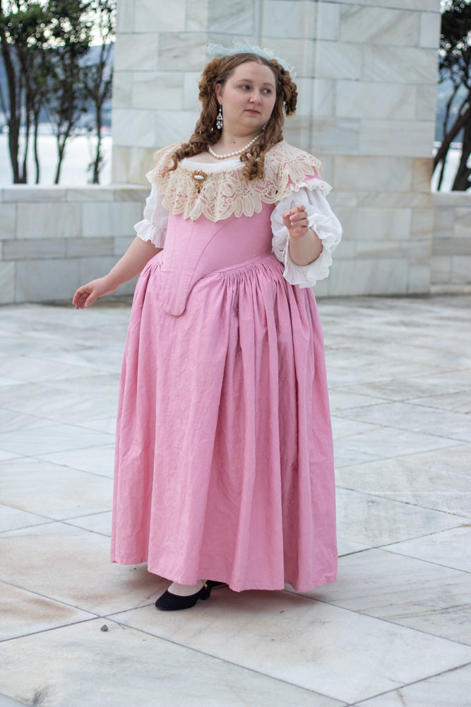 Dani is wearing View B in Size 42 with cartridge pleats. Her Anne Skirt & Ninon Bodice are made from a cotton duvet cover dyed rose pink. She trimmed her Ninon with an antique lace collar and wears it over a pieced Catarina Shift. All the fabrics in her outfit were thrifted or gifted: Dani wanted her Ninon ensemble to illustrate that it was possible to make beautiful historical costumes on a budget.