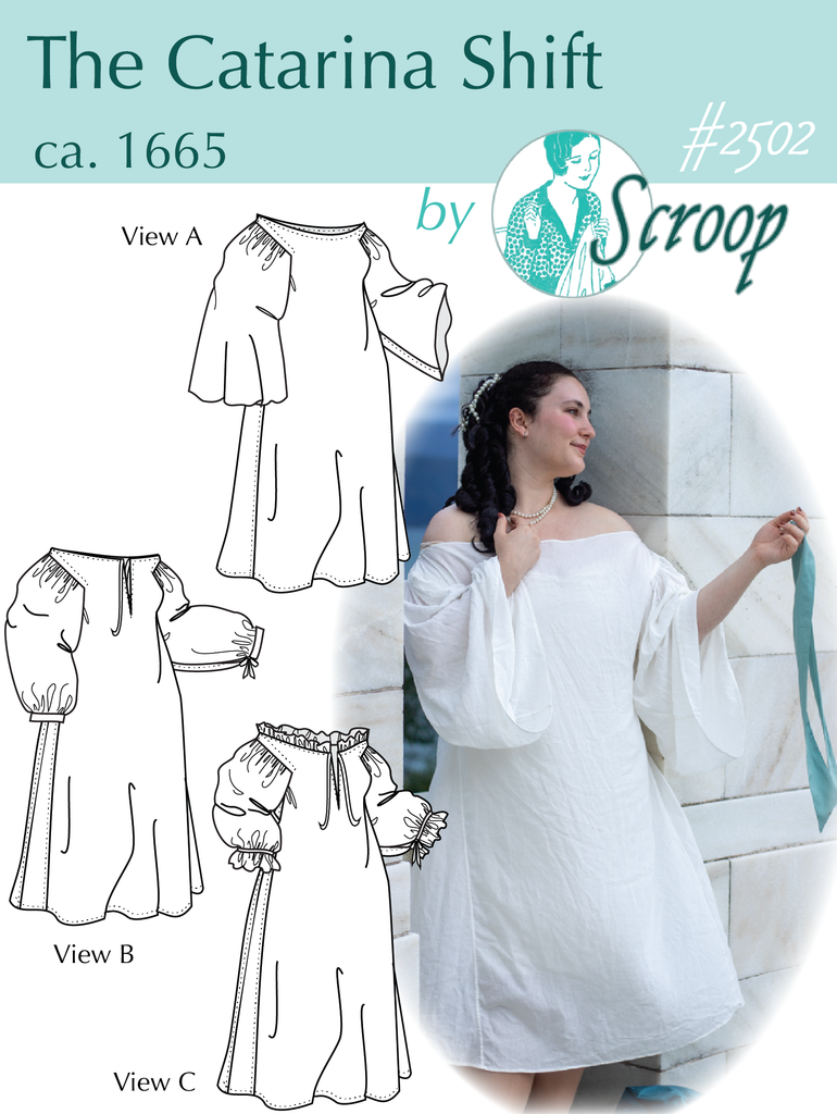 The Catarina Shift is an in-depth guide to making period-accurate shifts to wear under low-necked 17th century ensembles. The shift style protects your fashionable outer layers from sweat and dirt, while allowing glimpses of beautiful construction and trims at the décolletage and arms. Make a simple version for everyday wear, or decorate it with ruffles, lace, and ribbons.