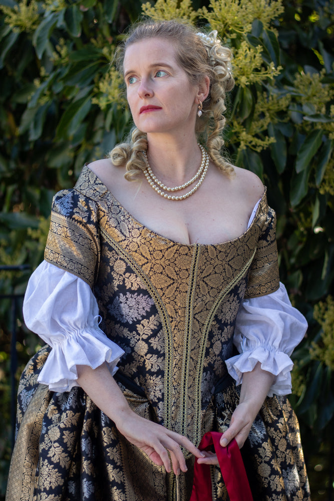 Hayley is wearing View C in Medium (38-40) in 150gsm light-medium weight pure linen under her gold, silver & black Ninon bodice and Anne Skirt