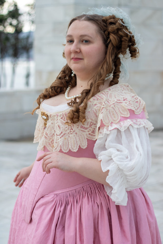 Dani is wearing View C in Large (42-44) in 100gsm looser-weave linen under her pink Ninon Bodice & Anne Skirt.
