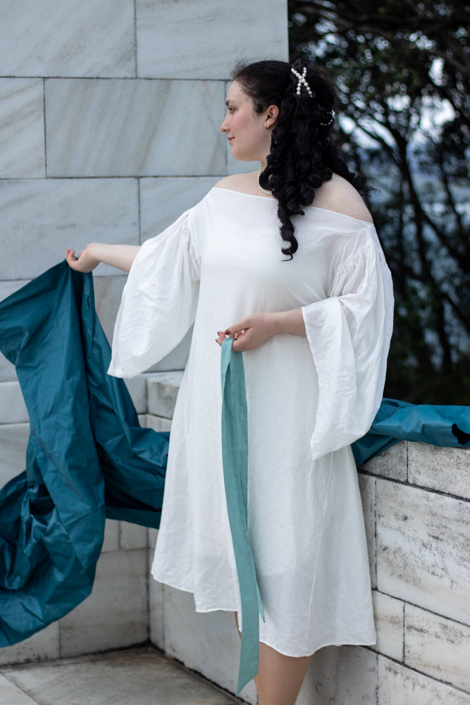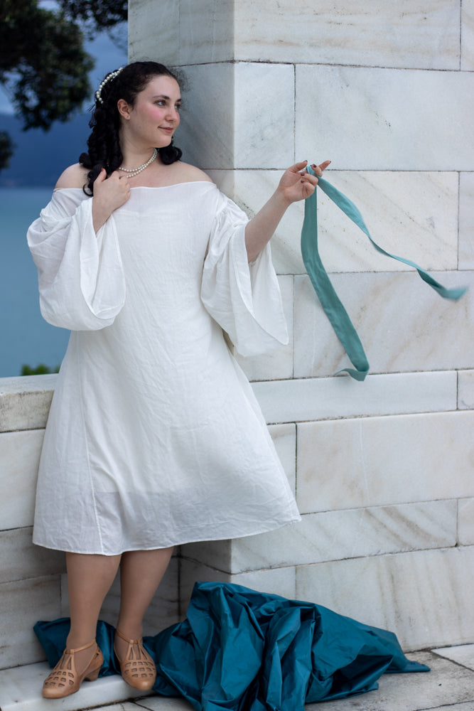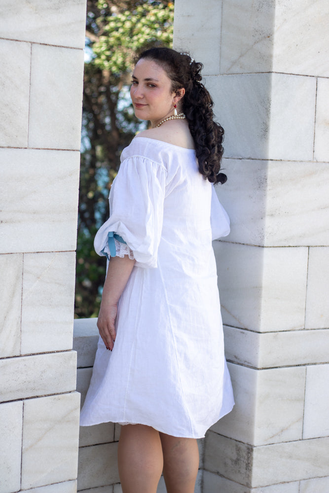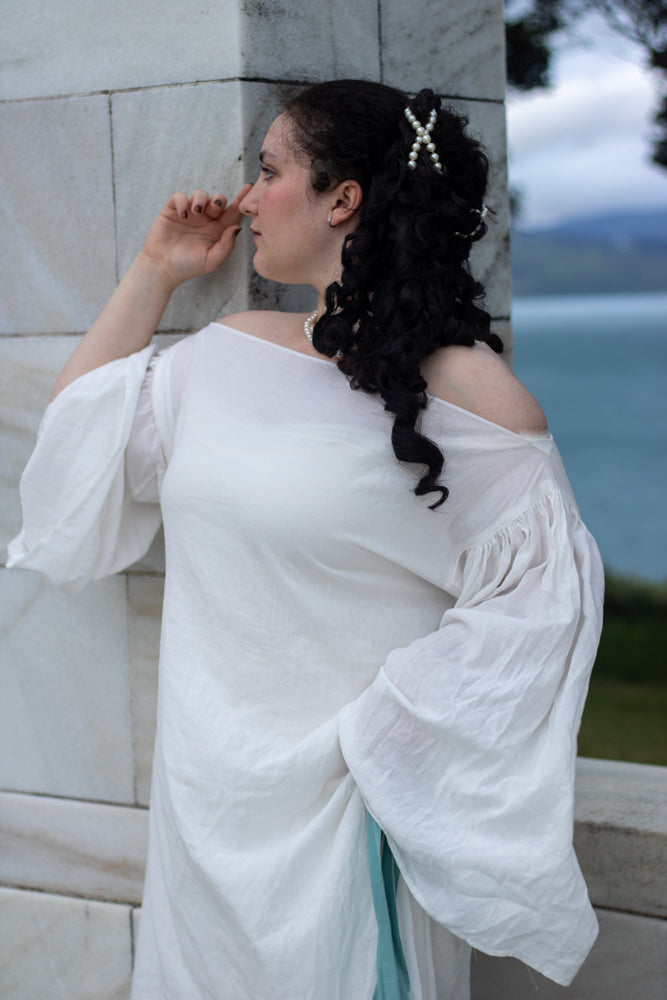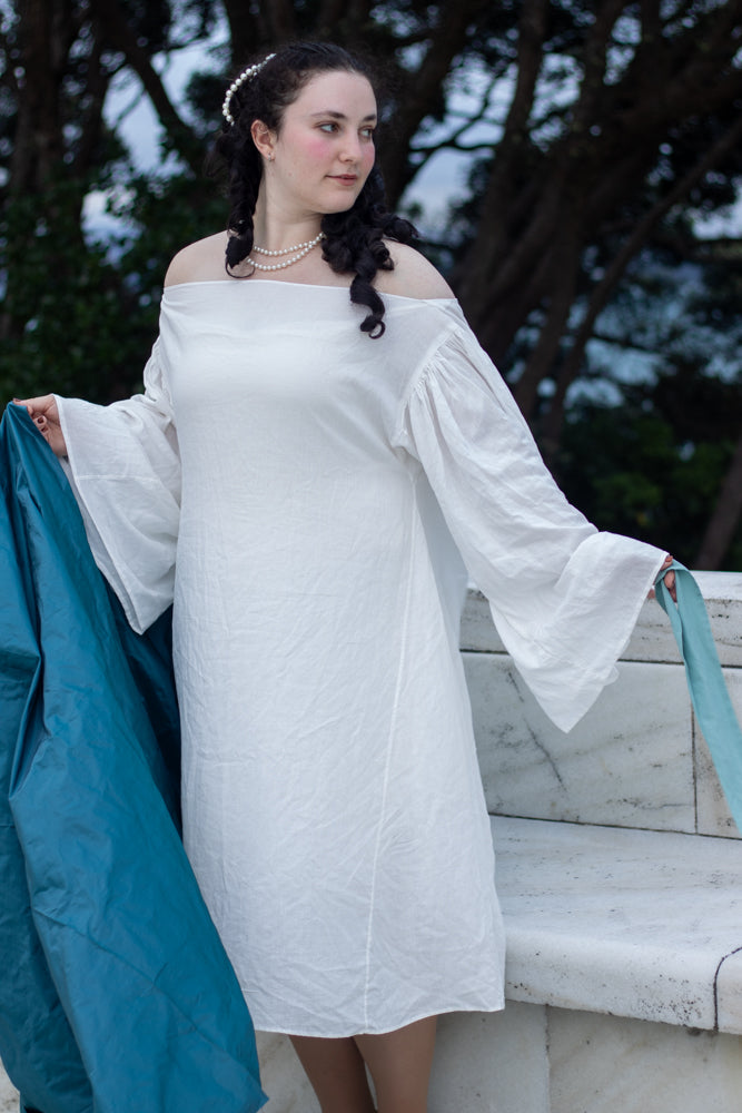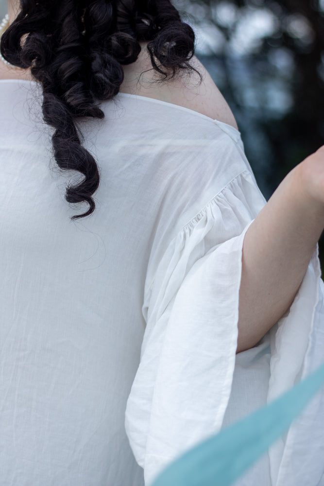 Rebekah is wearing View A in Large (42-44) in 100gsm voile weight ivory Italian linen from Drapers Fabrics NZ and View C in Large (42-44) in 150gsm light-medium weight bright white linen from The Fabric Store NZ.